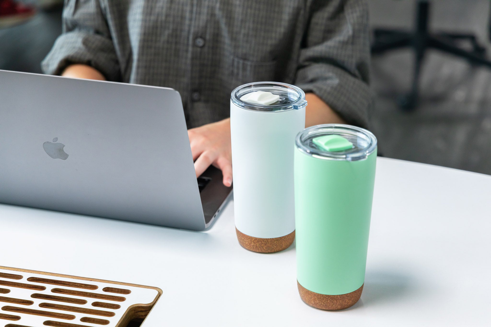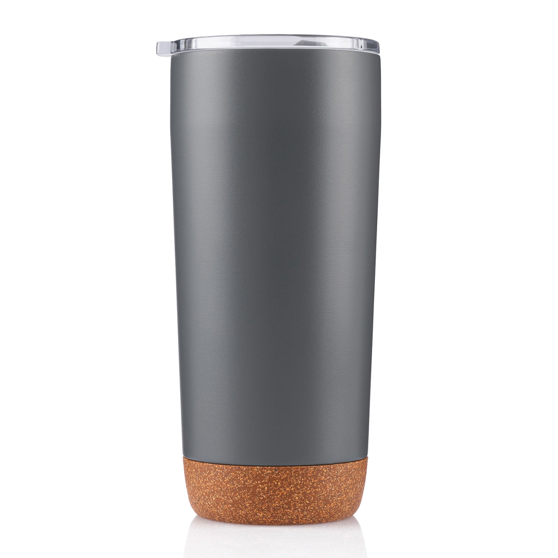 - 20 oz double wall 18/8 stainless steel thermal tumbler with stylish synthetic cork bottom to protect surfaces from scratches