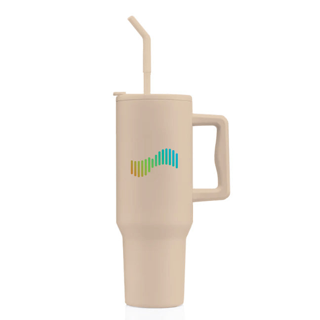 - Trendy matte-finished drinkware with an ergonomic handle in a variety of colors with matching straw, perfect for customization