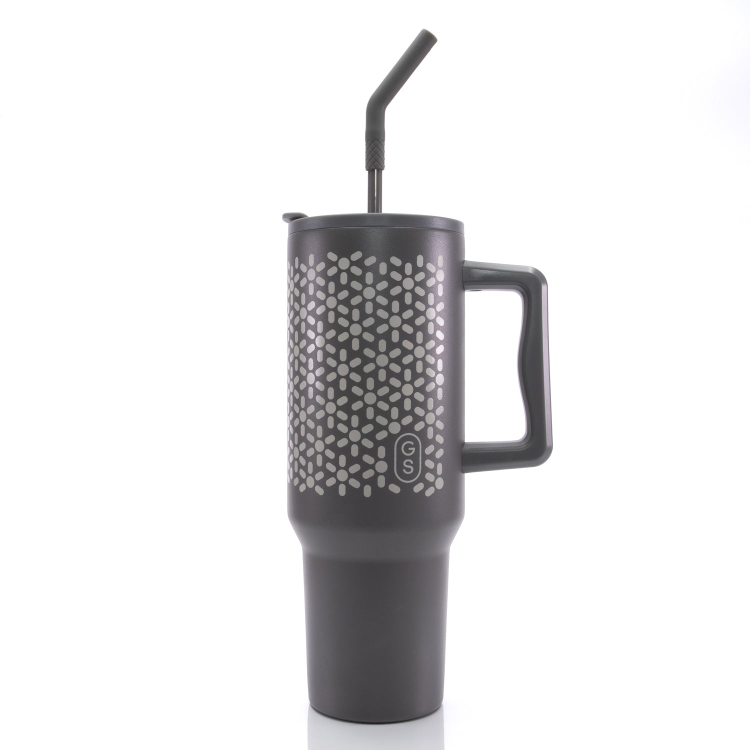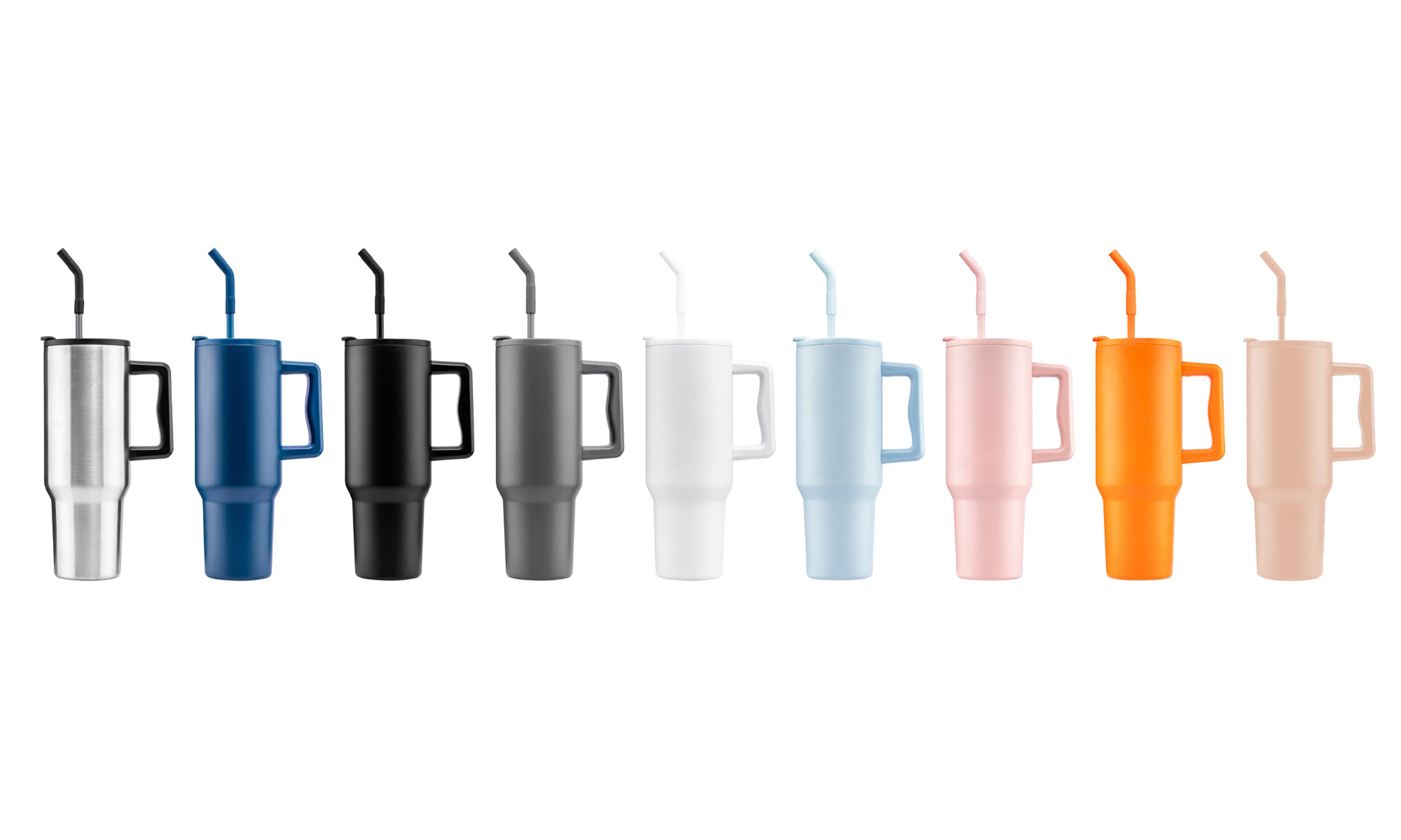 - Trendy matte-finished drinkware with an ergonomic handle in a variety of colors with matching straw, perfect for customization